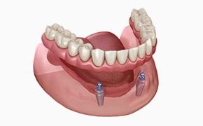 インプラントと入れ歯を組み合わせた治療方法です。顎の骨に埋め込んだインプラントを土台として、その上から取り外し可能な入れ歯を装着します。インプラントによって入れ歯がしっかりと支えられるため、装着時のグラつきが少なく、比較的安定した使い心地が期待できます。