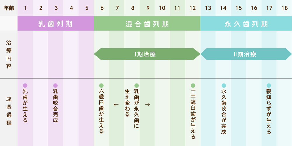 乳歯から永久歯へと生え変わる5歳~12歳頃のお子さんを対象にした矯正方法です。顎が成長する力を利用して、将来歯がきれいに並ぶスペースを確保します。この時期は顎の骨が柔らかいため、治療を進めやすい傾向があります。Ⅰ期治療で十分な結果が得られた場合は、Ⅱ期治療に移行せず、その後は定期的な経過観察で様子を見守ります。