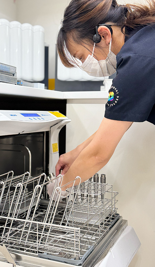 衛生管理において一番大切なのは、誰が作業しても同じ品質の滅菌を保証できる「質の均一化」です。当院には高性能な設備が整っていますが、それを使うスタッフが正しい知識と技術を持たなければ意味がありません。そのため、新しい器材が入った際の洗浄・滅菌方法の共有や、皆さんが作業しやすい運用方法を考えたり、他職種のスタッフさんと意見交換しながら「業務工程(仕組み)」をつくり上げることにとても楽しさを感じています。大きく飛躍しようとしているクリニックの前進し続けるメンバーでいられることが、とても喜ばしいですね。