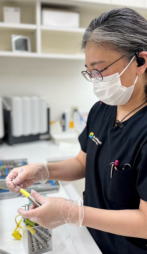 前職は呼吸器科の看護師として働いており、コロナ禍では最前線で対応にあたっていました。しかし、プライベートで親の介護もしており、感染リスクを抱えながらの生活が難しくなったため離職しました。それでも「医療に携わっていたい」という思いと、短時間での就業希望がマッチしたのが、このサポートスタッフの仕事でした。数ある医院の中から当院を選んだ最大の決め手は、高性能器材を備えた「ステリライゼーションルーム(滅菌室)」の設置や、多くのディスポーザブル(使い捨て)製品の導入など、院長が掲げる「安心・安全な医療の提供」という姿勢に深く賛同したからです。